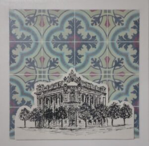 Audiodescrição: [Pintura de um prédio histórico em uma esquina, em preto e branco. Ele tem dois andares e ornamentos esculpidos na fachada. Nas calçadas, algumas árvores. O fundo é uma parede de azulejos coloridos.]