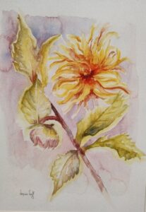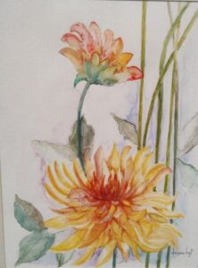 Audiodescrição: [Pintura de duas flores, uma na parte superior e outra na parte inferior. O fundo é branco. À direita, algumas ramas verdes passam de alto a baixo da pintura. As flores são em tons amarelo, rosa e vermelho, com muitas pétalas finas. A flor de baixo é maior, ocupa quase toda a parte inferior e está bem aberta. A de cima é menor, como se ainda estivesse se abrindo.]