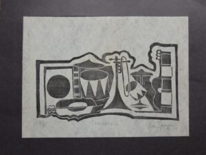 Audiodescrição: [Gravura em preto e branco com uma série de instrumentos musicais, alguns parcialmente sobrepostos aos outros e contornados por uma linha curva preta. À esquerda, um círculo preto. À direita dele, formas que parecem um violão. Mais ao centro, um bumbo e um trompete, um tambor e um prato de bateria. À direita, um vilão e caixas pretas e brancas empilhadas.]