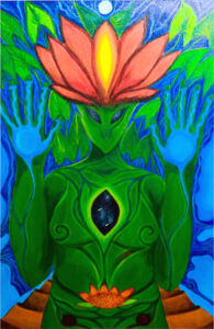 Audiodescrição: [Pintura de um ser com o corpo verde, da cintura para cima, com formas humanas femininas. Seus cabelos são como uma planta com grandes folhas rosa com uma folha central amarela. O rosto quase não tem feições, com olhos esticados para o alto. No centro do peito, há uma abertura ovalada onde aparece o espaço e constelações. Na altura do umbigo, há uma flor, que parece a flor de lótus, vermelha. O ser está mostrando as palmas das mãos para nós, que parecem lagoas, com dedos e veias parecendo rios. O fundo é azul, com algumas folhas verdes.]