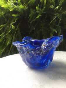 Audiodescrição: [Um vaso de vidro azul sobre o tampo de uma mesa branca, com um conjunto de samambaias ao fundo. O vaso é arredondado, com a boca irregular, algumas partes mais altas e outras mais baixas e tortas. Na metade superior do vaso, diversos pequenos pedaços de vidro grudados, alguns transparentes e outros coloridos.]